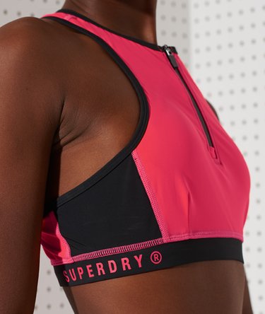 Make sure you are beach ready when the time comes with the Sport Bikini Top featuring a zip fastening, racer back and a Superdry branded hem.