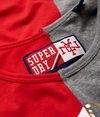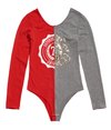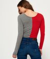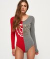Superdry women's Upstate bodysuit. A sporty but chic long sleeved bodysuit featuring two-colour cracked print stripes on the sleeves with a cracked finish Superdry Track League print in two colours on the front. The Upstate bodysuit has a popper fastening gusset and is finished with a Superdry logo tab on the right cuff.
